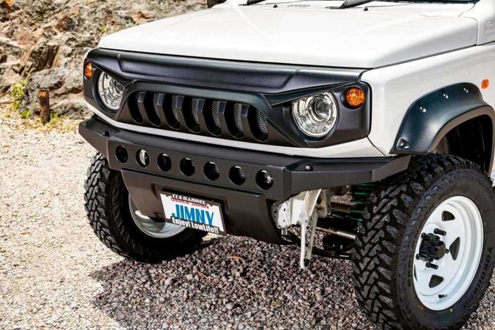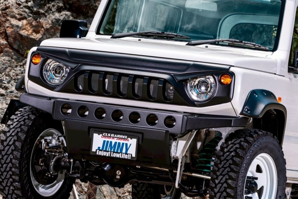 フロントバンパーと合わせたいのが、フロントグリルだ。ヘッドライトをツリ目のバッドフェイス化するこのグリルを合わせることで、ジープ・ラングラー風な顔立ちに仕立てられる。純正ヘッドライトやウインカーはそのままに、純正グリルと交換するだけでOK。フロントグリルは、ジムニー/ジムニーシエラ(JB64/74)に装着でき、純正ボルト4本で取り付けられる。
