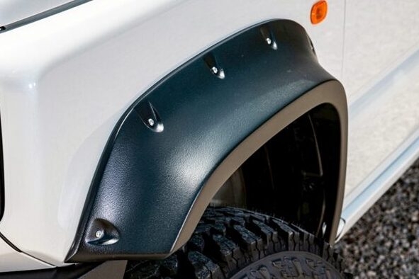 5ドアボディのノマドに合わせ、オーバーフェンダーも新たに開発。ノマド純正フェンダーから+10mmワイドとは思わせない存在感は、絞り込んだ逆反り形状によるもの。ダミービス(6mm)もアイキャッチとなっている。フロントはシエラ用と同じものだが、リアは5ドアボディに合わせ、ドアが開くように3分割になっているのが特徴だ。