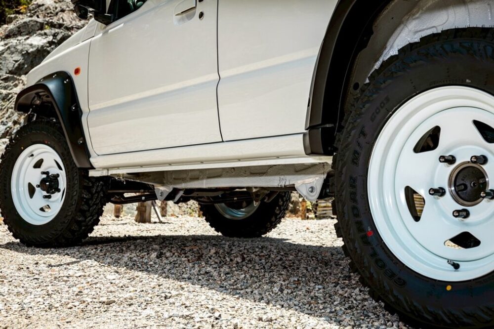 スタイリングは、いかついバッドフェイスに仕立てるフロントグリル、縦方向を縮めたショートタイプのフロントバンパー、オーバーフェンダーを装着。なかでもフロントバンパーは、3インチリフトアップして245/70-16タイヤを履く際、ハンドルを全開してもバンパーに干渉しないよう設計している。