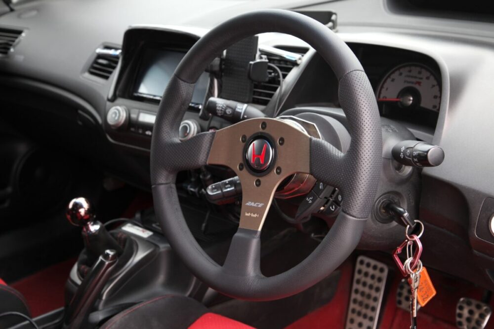 ハンドルはMOMO RACEを使用しながら、ホンダのエンブレムをしっかり配置。ここにもこだわりがうかがえる。シフトノブも交換している。