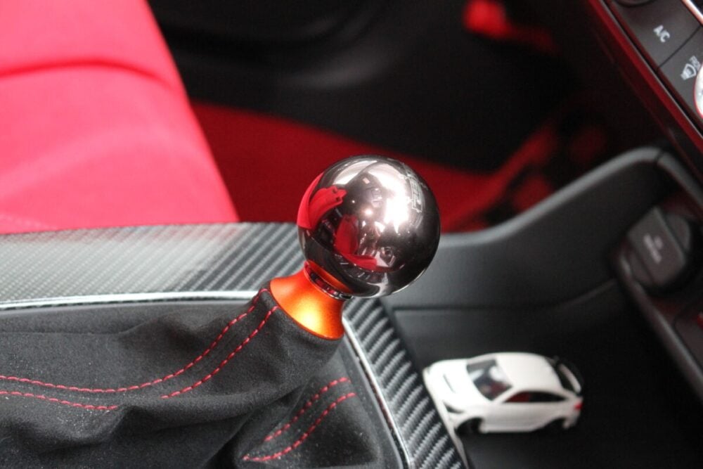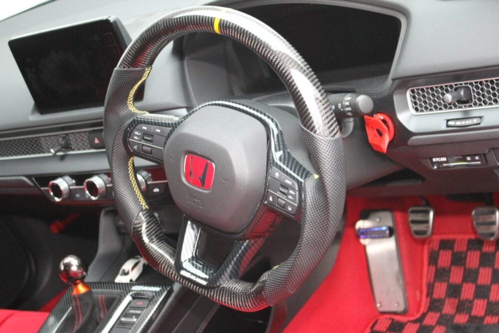 あとはステアリングカバーとセンターマーカー。ここは運転中に視界に入る場所なのでデザインにこだわりたかったところです。センターマーカーは赤にするタイプRオーナーが多いですが、ワンポイントとして黄色にしみました」