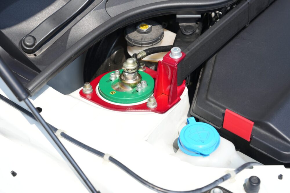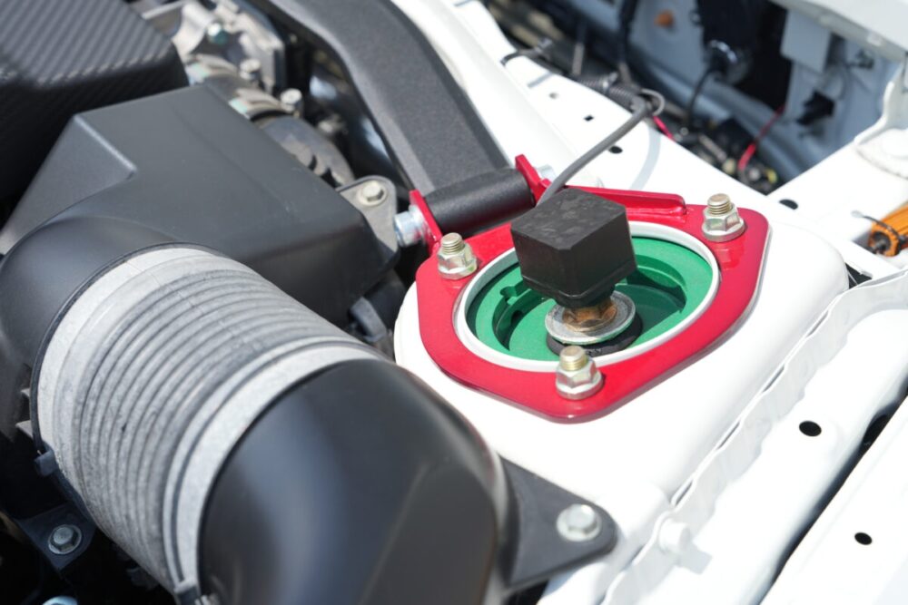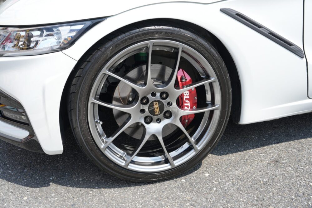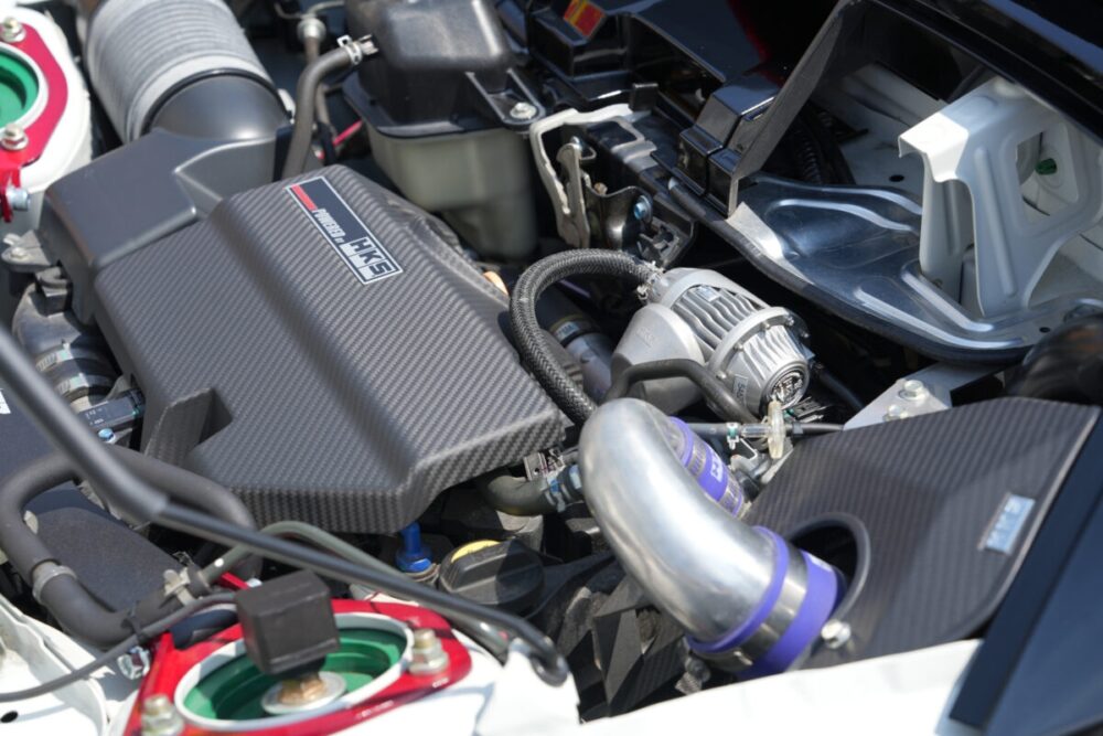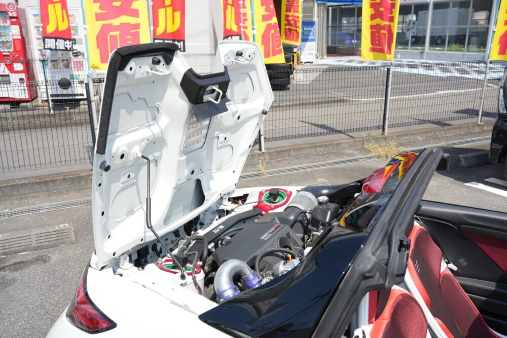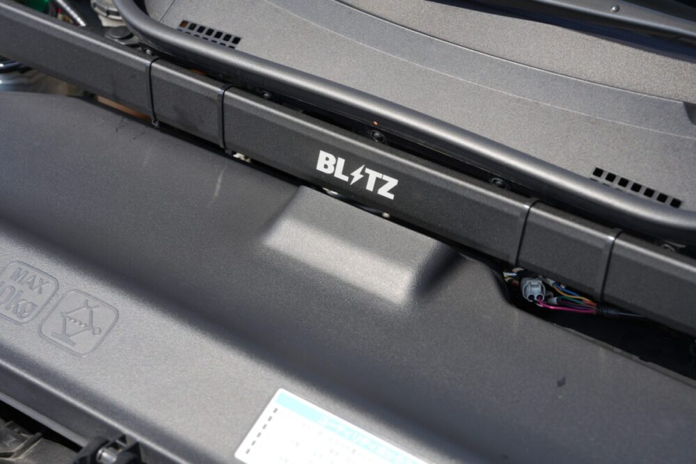 サスペンションにはテイン、ブレーキキャリパーにはブリッツを配置。前後にタワーバーを入れてボディ剛性を上げてキビキビした走りを実現している。軽量MRだからこそ、これらの恩恵は大きいだろう。