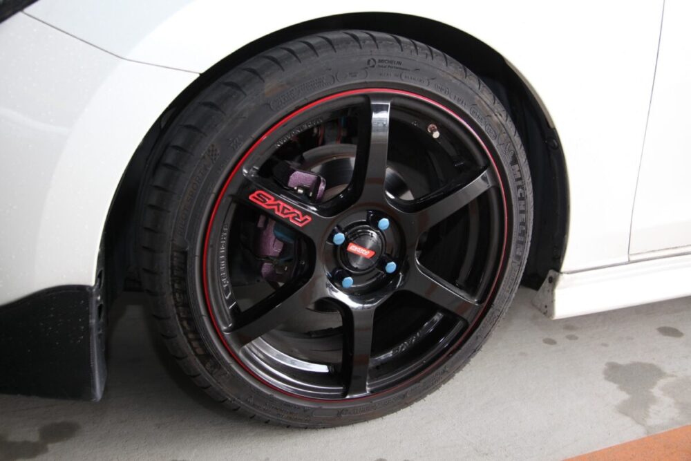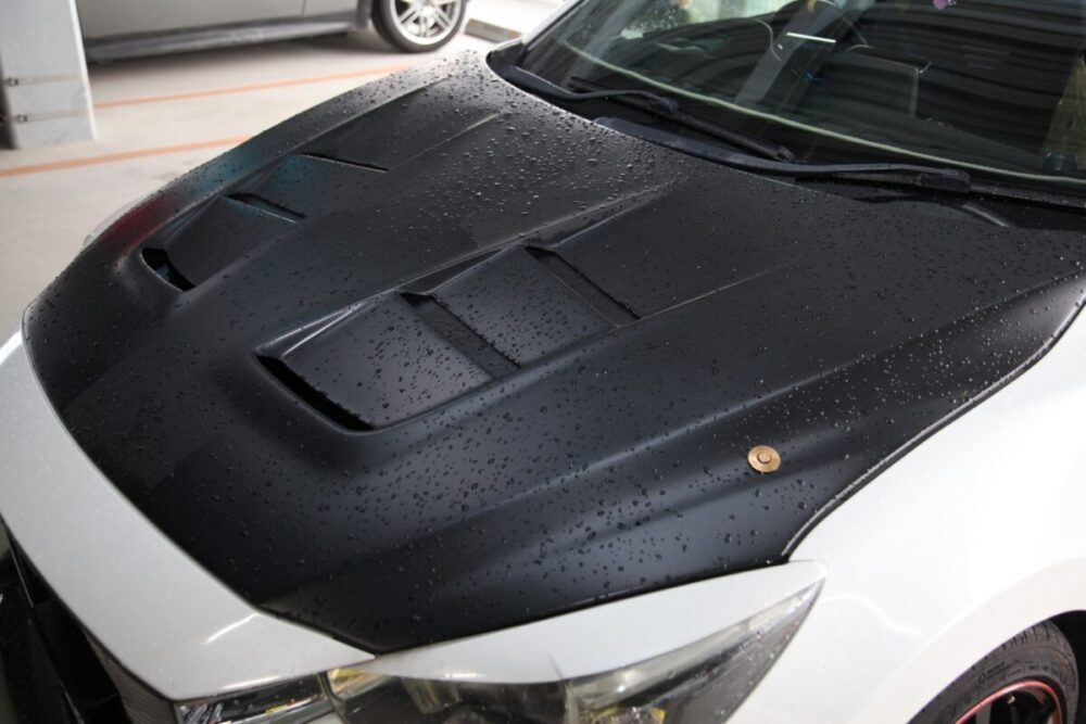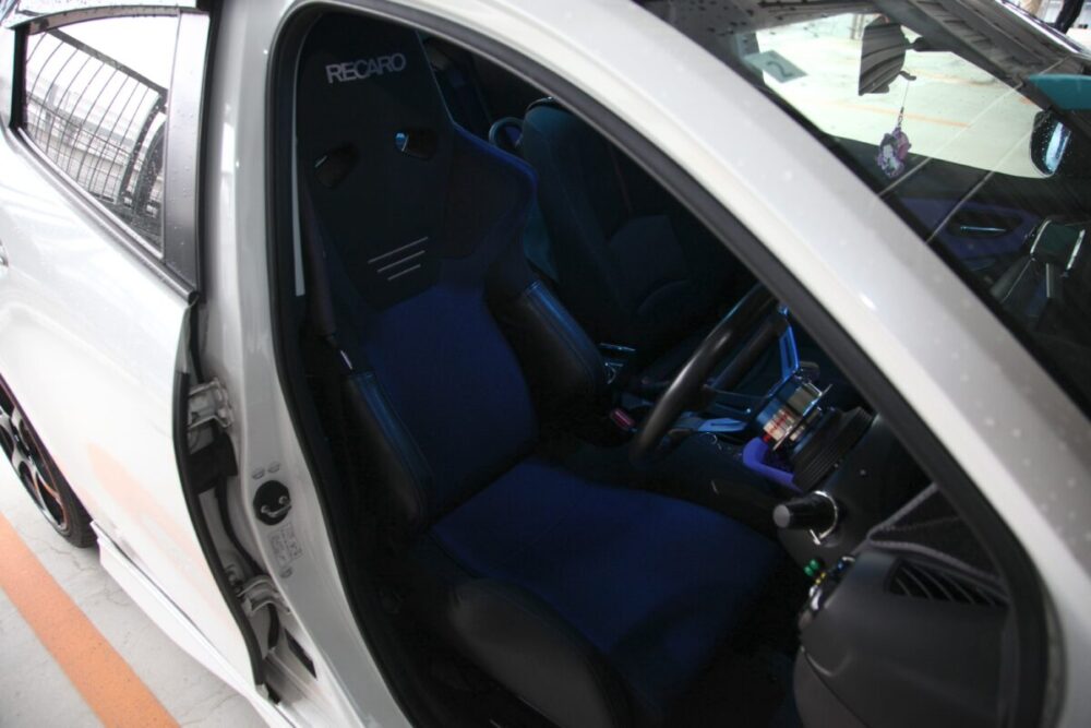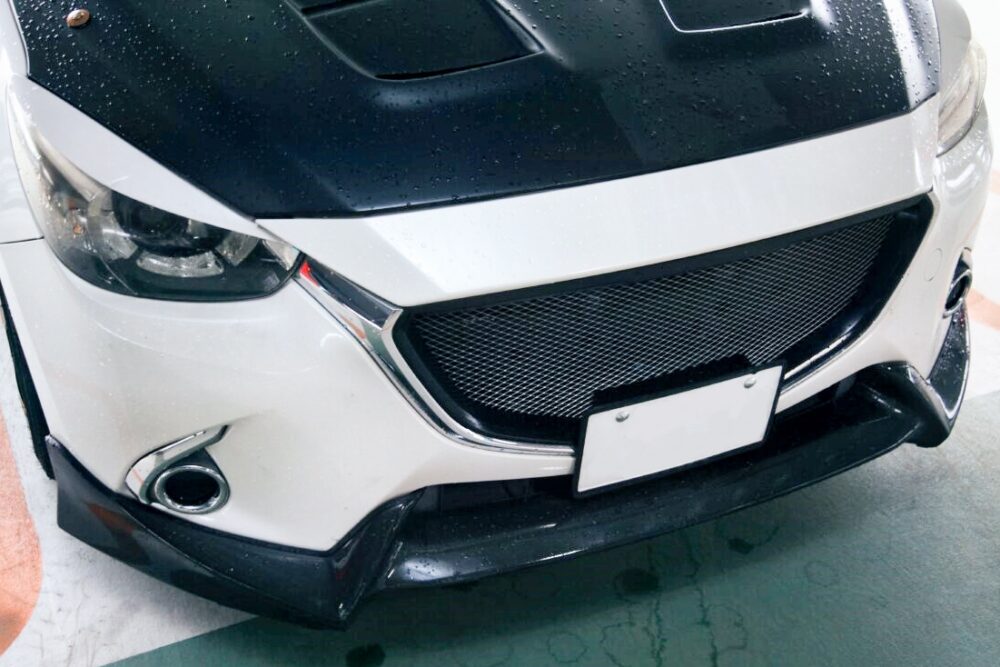 ボンネットとフロントのスポイラーはRE雨宮で統一。ホワイトの車体をブラックで引き締めるストロングイメージだ。サイドとリアはホワイトを選んでいるので、よりフロントマスクの印象が強くなる。