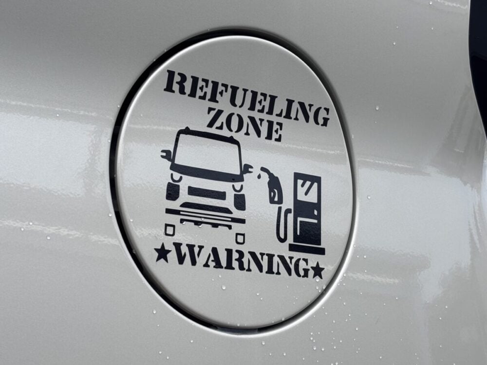フロントグリルのオレンジのマーカーはランドリックジャパン。給油口のステッカーはメルカリで購入しました」
