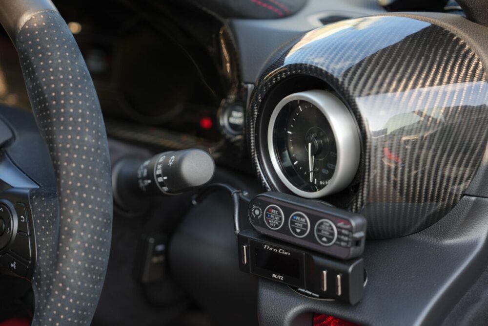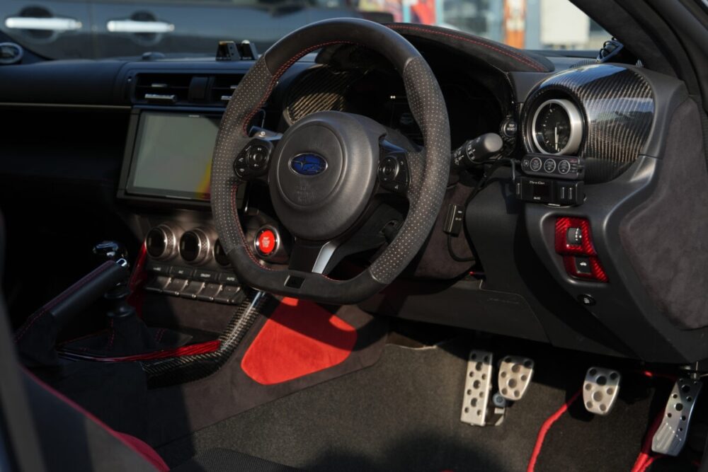 シートにレカロを配しているが、注目したいのはパネル類。ドライカーボンとアルカンターラを自作で配置してオリジナリティ溢れる内装を実現している。