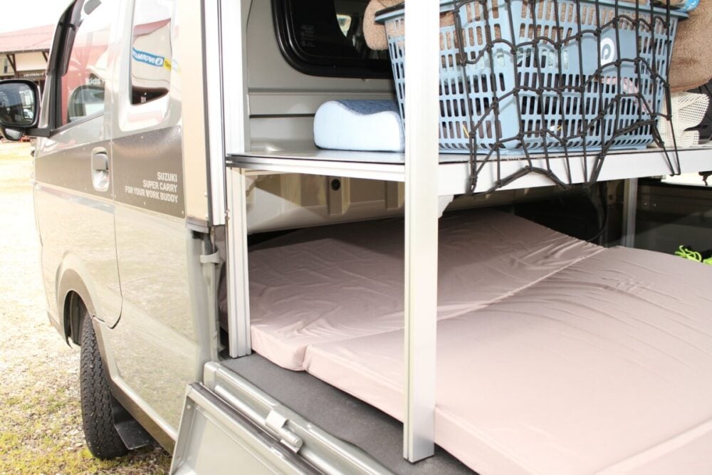 スーパーキャリーは荷台の足もとに奥行きがあるので、マットレスを敷いても足を伸ばして寝られますよ」