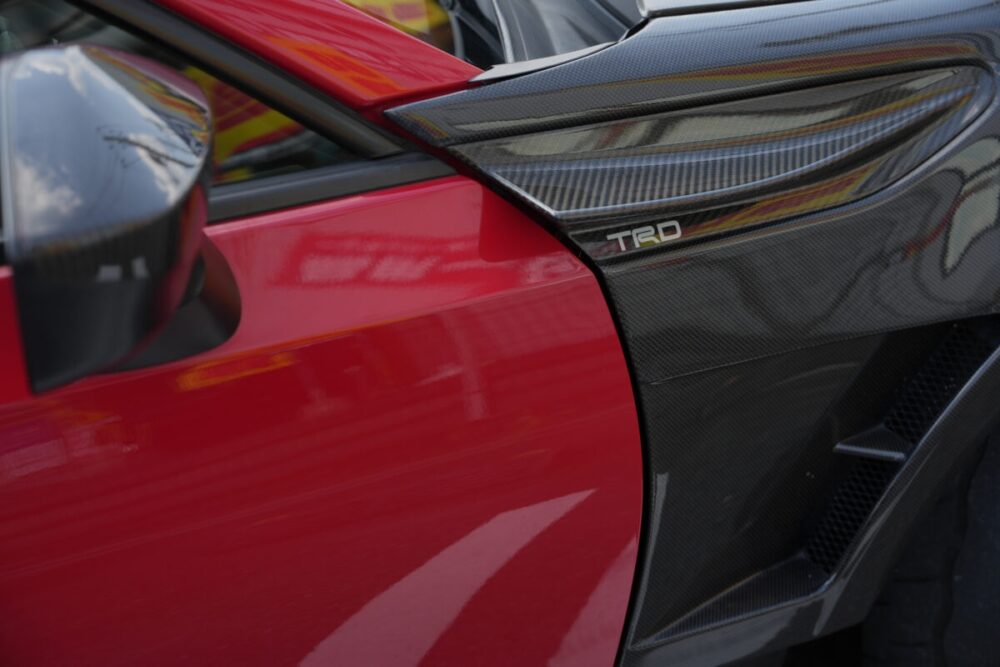 カスタムのポイントにも挙げられたボンネットも含め、非常によくまとまっている印象だが、意外にもメーカーは統一していない。それぞれの特性を見極め、レッドとカーボンの組み合わせを操り、オリジナリティの高い外装に仕上げいる。