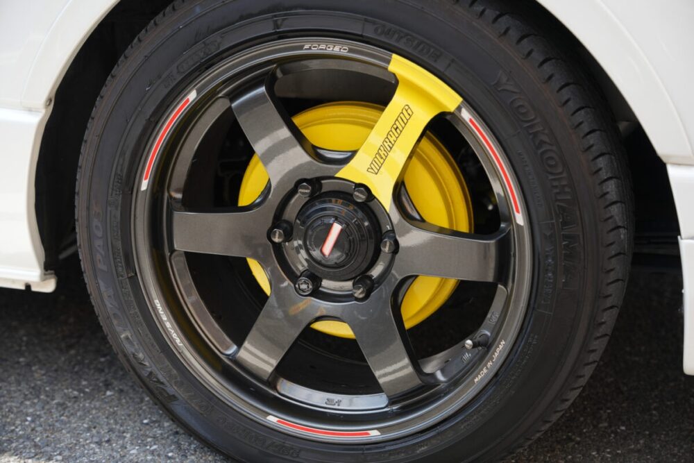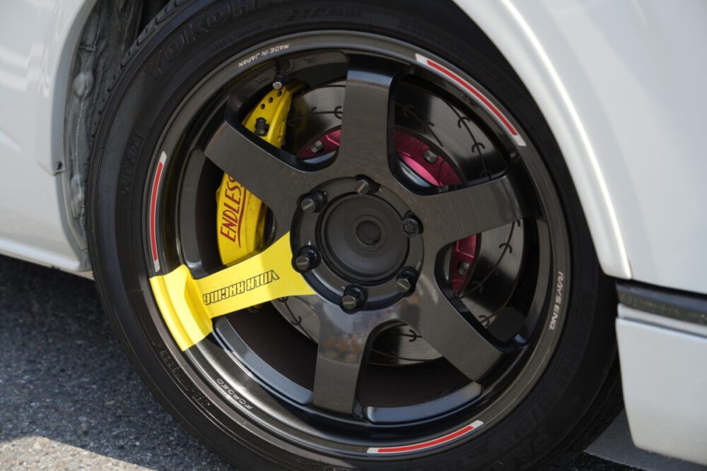 エンドレスのビッグキャリパーはワンオフ。ローダウンのオーリンズやOS技研のLSDと組み合わせ、ハイエースとは思えぬコーナリング性能を実現する。