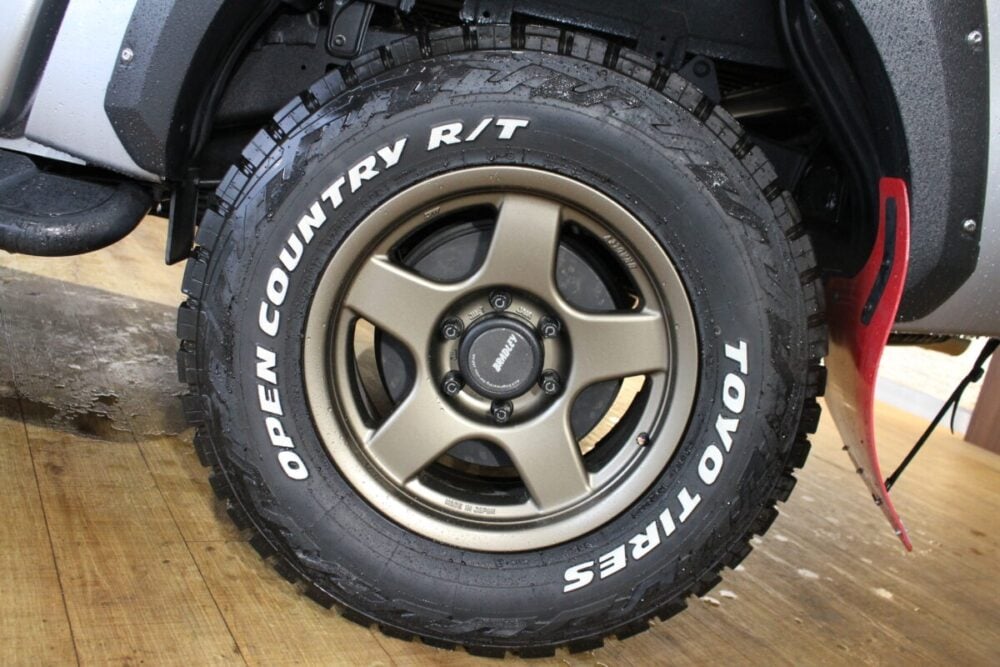 サスペンションでフロントのみ2インチアップ。ホイールのインチ数は変えずに社外アルミを装着しています。派手になりすぎないよう、見た目のバランスも大事にしています」