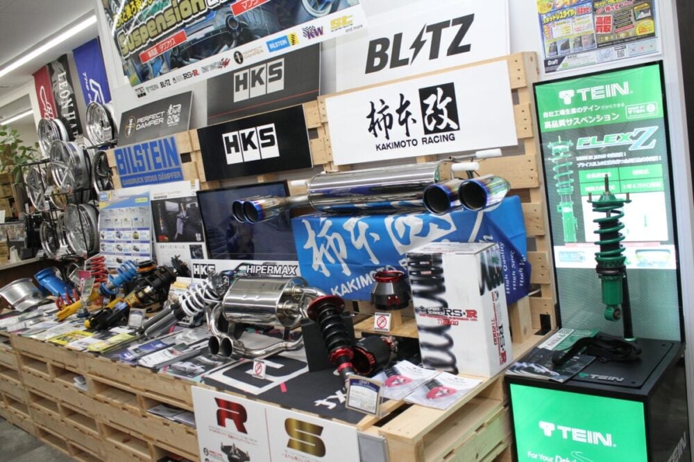 スポーツカー&ミニバンコーナーには「RAYS」「WORK」「HKS」「BLITZ」などのブランドを活用したローダウン&ドレスアップパーツを取りそろえ。さまざまなユーザーの要望に応える提案をしています。