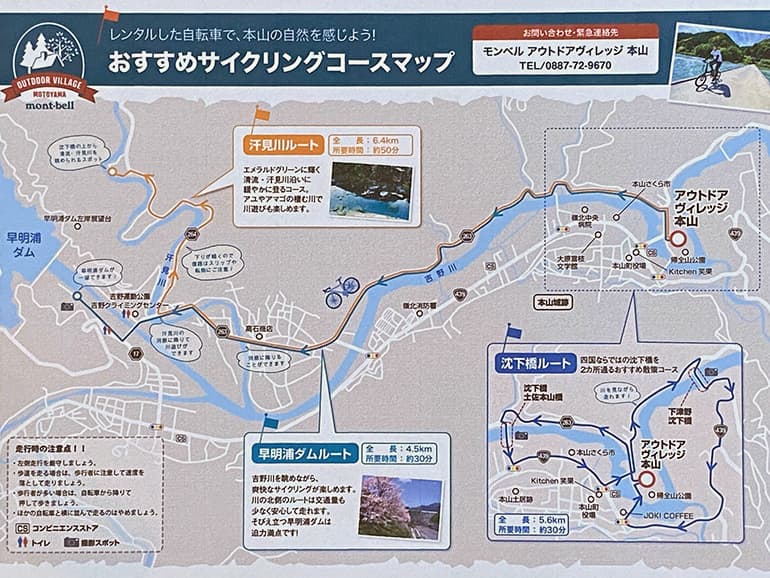 おすすめのサイクリングコースがあり、①沈下橋ルート、②早明浦ダムルート、③汗見川ルートが設定されていますので、体力と相談してサイクリングを楽しみましょう!
