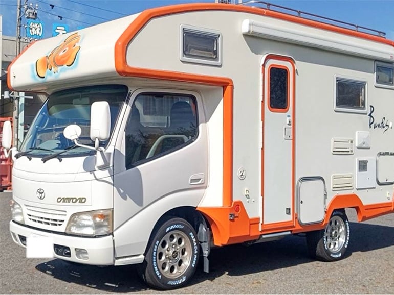 2005年式トヨタ・カムロードをベース車にしているキャブコンタイプ(居室部分を大幅に改造)の大型キャンピングカーです。