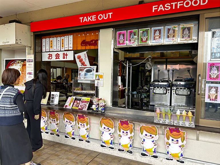子どもたちがお腹を空かせていたので、ファストフード店でバニラソフトクリームと焼きそば、五平餅を注文しました。