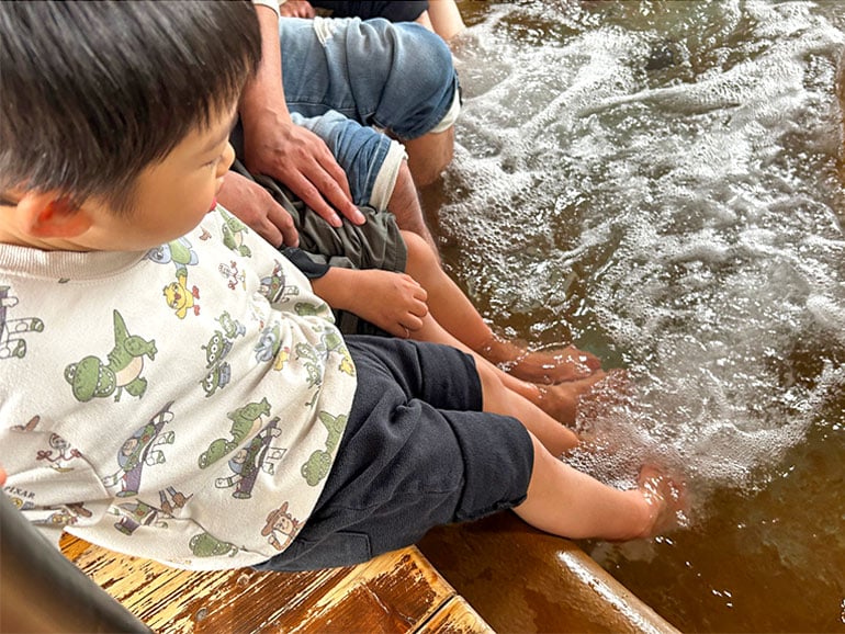 足湯の温度は40度で、ジェット付き。温度も心地よく家族で癒されました。