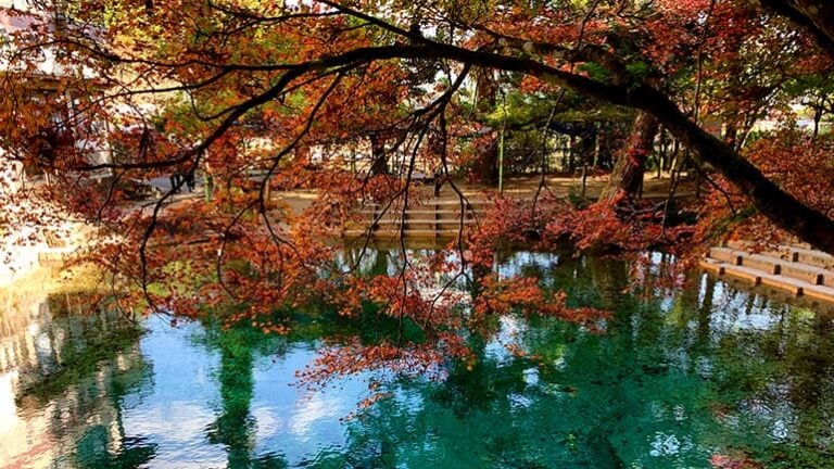 青く透明な水辺のスポットは日本全国に点在していますが、もみじと一緒に写真が撮れるところはなかなかないと思います。