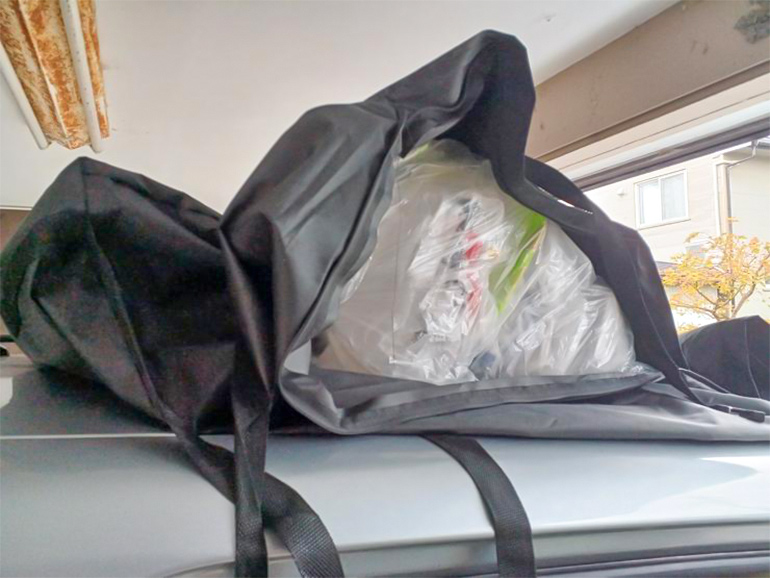 本来ならルーフボックスがほしいところですが、ゴミ専用ということもあり、安価なルーフバックを選びました。
