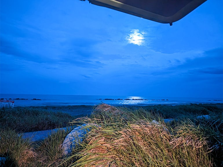 夜はとても静かで落ち着いており、波音を聴きながらゆったりと過ごせる車中泊スポットです。