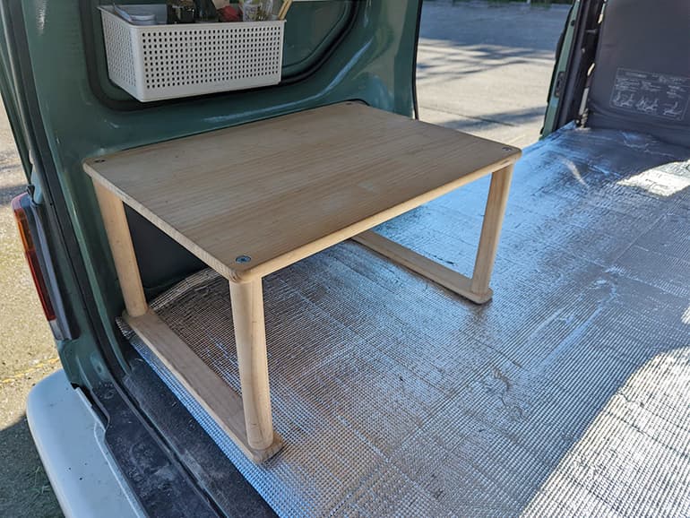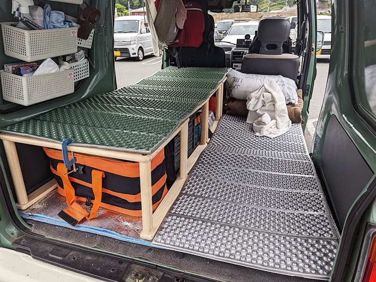夏場の車内の熱を逃すために、空間を作ることで床の熱からも逃れることができ、このベッド作りは大成功でした。