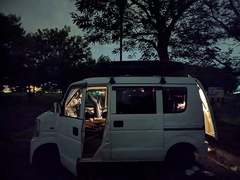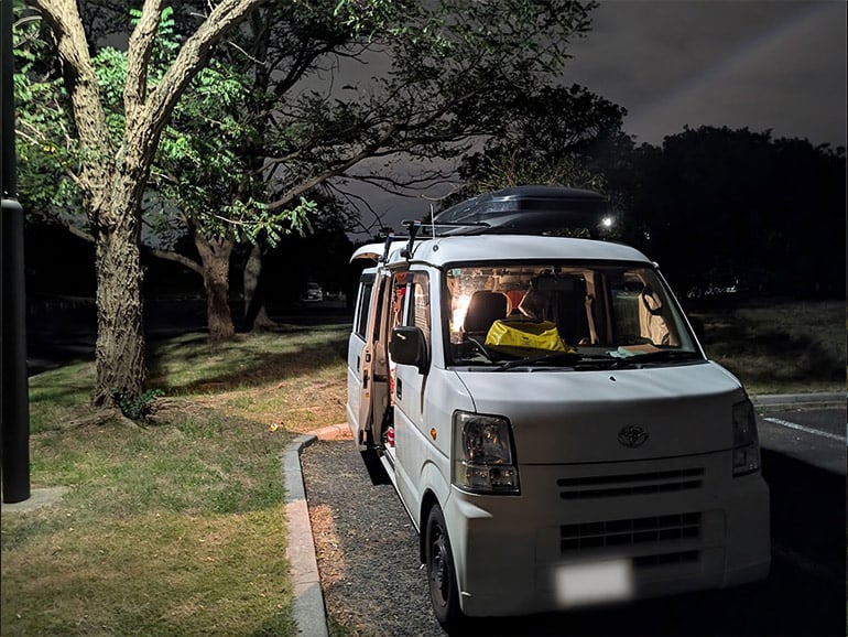 そんな地方都市・四日市での車中泊は、Googleマップで見つけた臨海部の緑地公園の駐車場を利用しました。