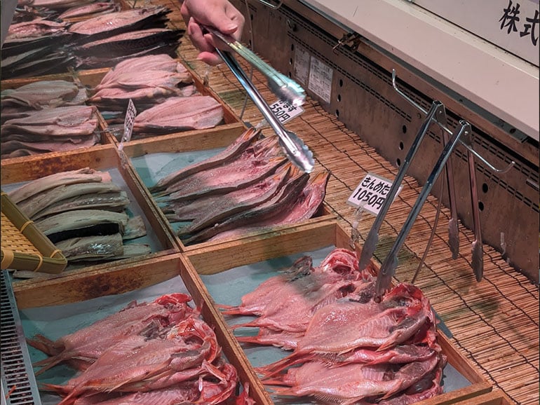 1.ショーケースから好みの干物をトングで選ぶ(サバやアジ、キンキなど)