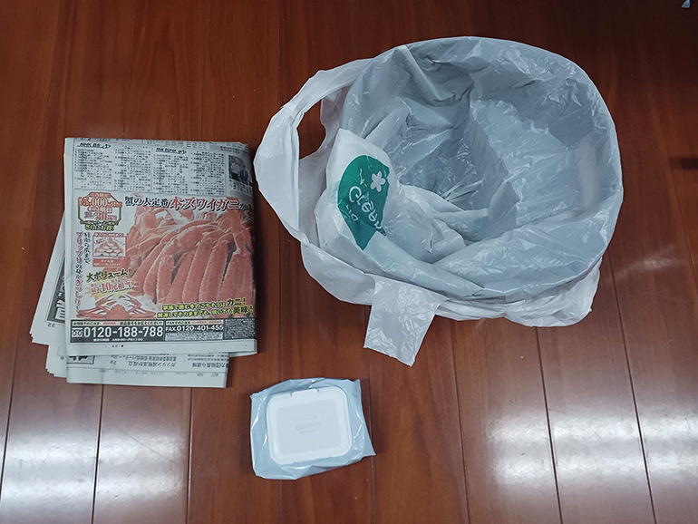 男性なら小用に空のペットボトル、大用にはレジ袋とウェットティッシュ、新聞紙(またはペット用砂)、バケツ(便器代わり)。