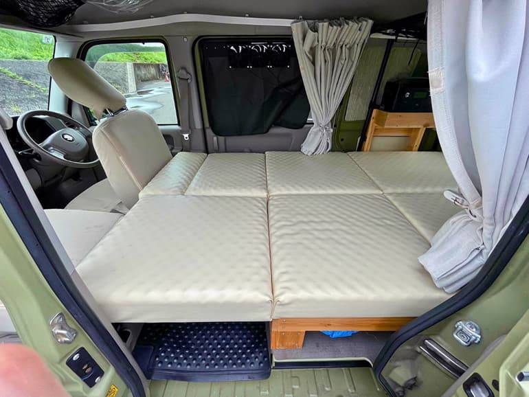出来上がった車中泊仕様のエブリイは、室内が狭いものの、想像以上に快適な空間。