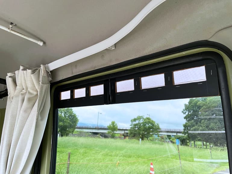 週末車中泊をしていたときはその都度既製品のシェードを窓に貼っていたのですが、長期の車中泊旅で毎日のことになるならできるだけパッと済ませたいと考え、カーテンを設置しました。
