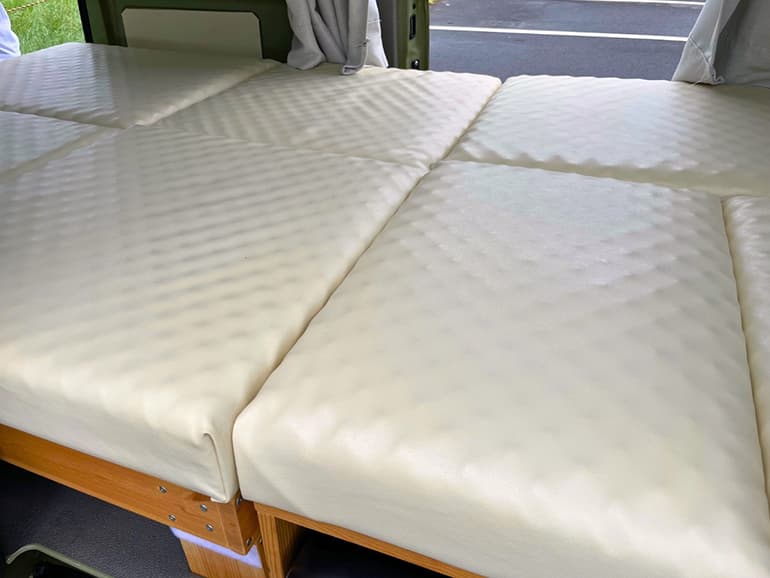 助手席の背もたれを前に倒して、ベッドから引き出したパイプの上にマットレスを置いたら、居住空間が拡大。