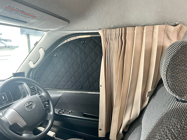 次に活躍するのが、居住スペースのサイド・リアすべての窓に装着されている遮光カーテンです。