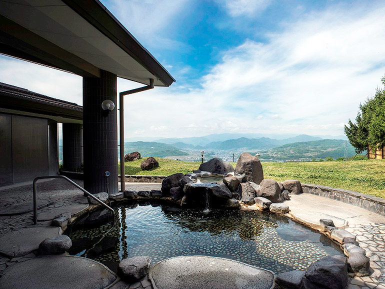 露天風呂からは善光寺平を見渡す開放的な景色が広がり、夕暮れ時は特におすすめ。