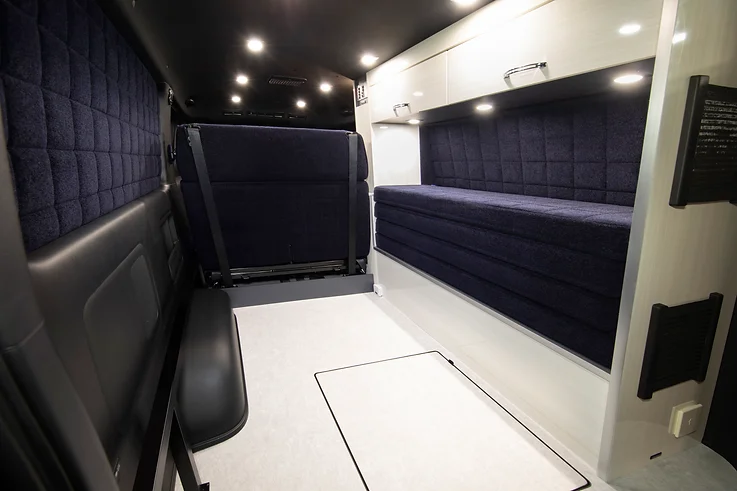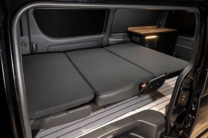 MOBIFLAMEのセカンドシート後方の右側に、マルチキャビネットを設置したシンプルなレイアウト。MOBIFLAMEのセカンドシートは、シート単体でダブルベッド(全長1900×幅1200㎜)に展開するスマートベッドシステム。女性でも軽い力で簡単にベッド展開が可能だ。