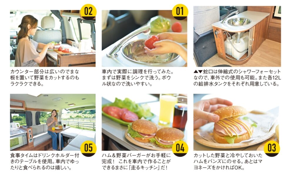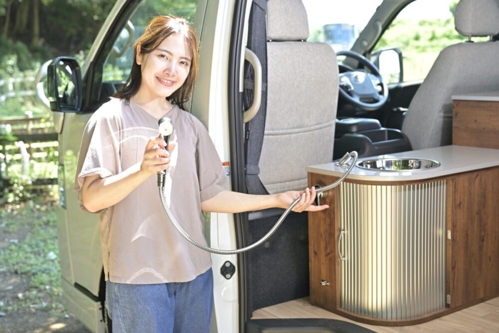 ORCAはシンクつきの使い勝手のいいキッチンカウンターを備えている。食材を洗ったり、使用した食器類を洗ったりが車内でできるのは便利。またシャワーノズルは伸ばすことができるので、外で汚れものを洗うことはもちろん、顔や頭を洗うことだってできるのだ。