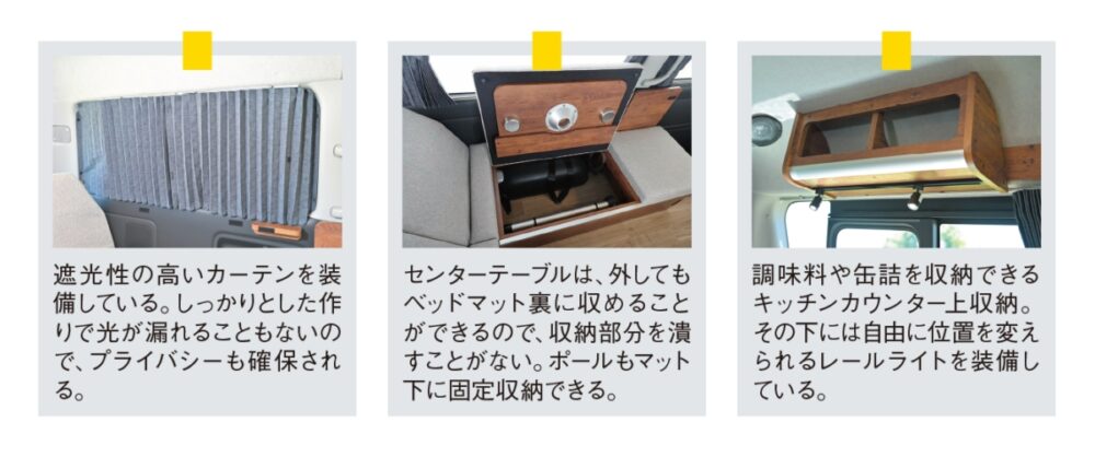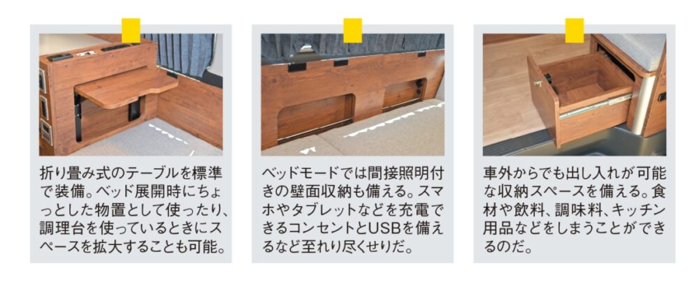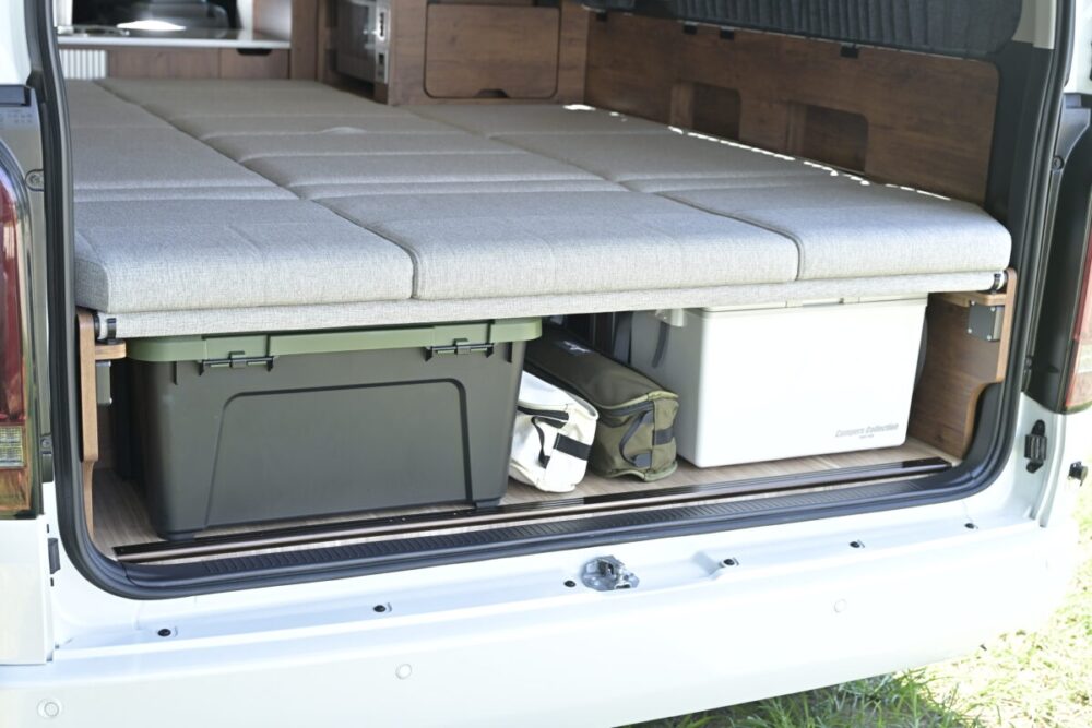 リビングモードやベッドモードのときに快適に過ごせるように、車両の最後部のマットを3分割として、それぞれ独立してリクライニングさせることができる。これによりマットを起こせば上体を預ける背もたれとして使えるので、クッションなどがなくてもゆったりとした姿勢になることができるし、車外に出ずにベッド下の収納にアクセスすることも可能なのだ。またオプションの延長マットをギャレーとベッドの間に展開することで、通常時では1840㎜の長さが2400㎜まで延長されるので、ゆったりと寝ることができるようになっている