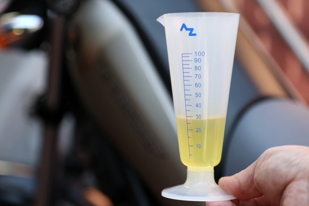 一方でバイクの場合、多くの車種は燃料タンク容量が20L以下。溶剤に適合するメートルグラス(目盛付きの容器)などを使って、適量を添加したい。例えば燃料タンクが10L容量の場合、10L=10000mlなので「10000×0.003=30ml」の計算となる。