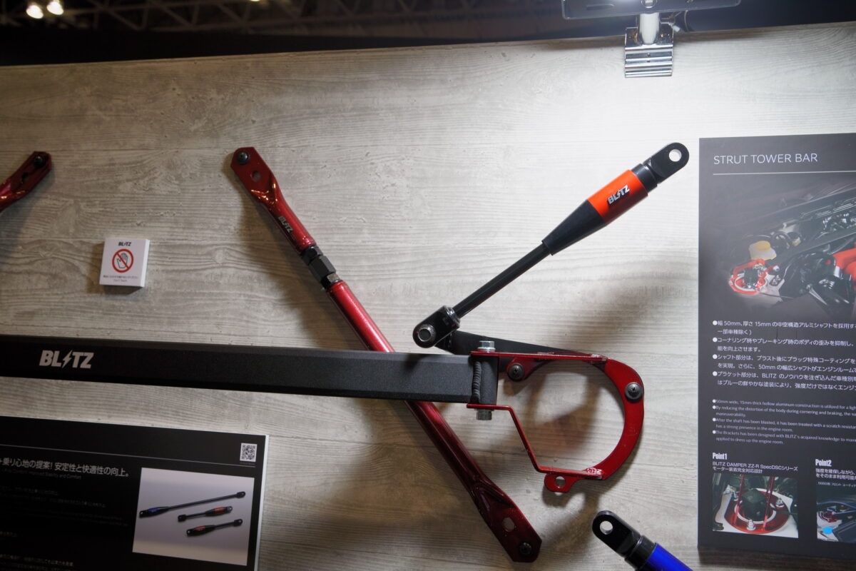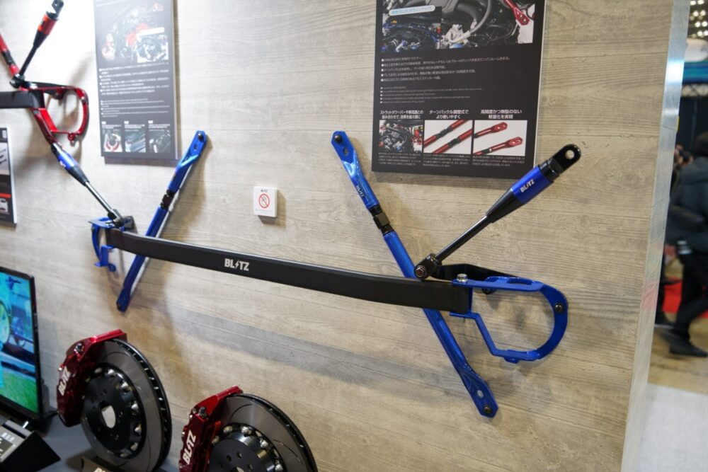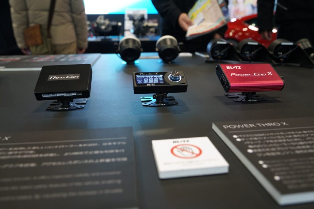 ブリッツブースでとくに注目すべきは、今回が初公開となるアイテムを含む3つの主力製品だ。電子パーツから足まわり、そしてボディ補強に至るまで、総合パーツメーカーならではの多彩なラインナップが揃う。