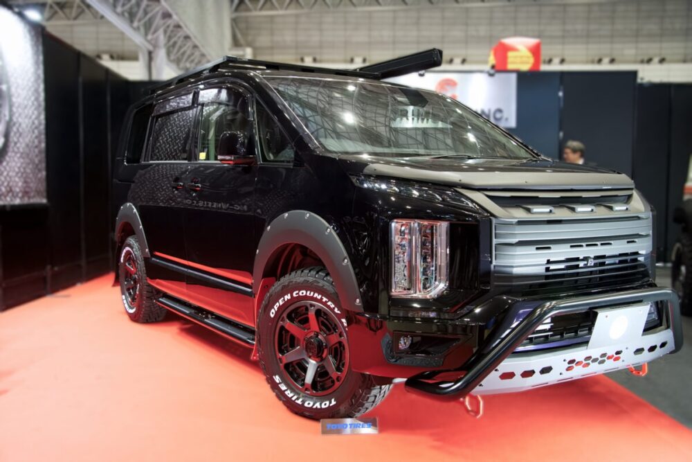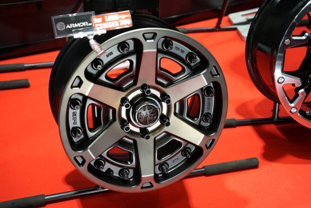 MGのブースに陳列されるのは、ミリタリー感を全面に押し出したホイール「ARMOR FF」を装着したデリカD:5だ。