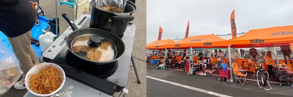 サーキットのパドックは基本的に火気厳禁。そこでIHコンロや湯沸かしポットなどを使って食事を作ることができる。特に秋から冬の寒い時期は、体を暖めてくれる食べ物や飲み物がありがたい。