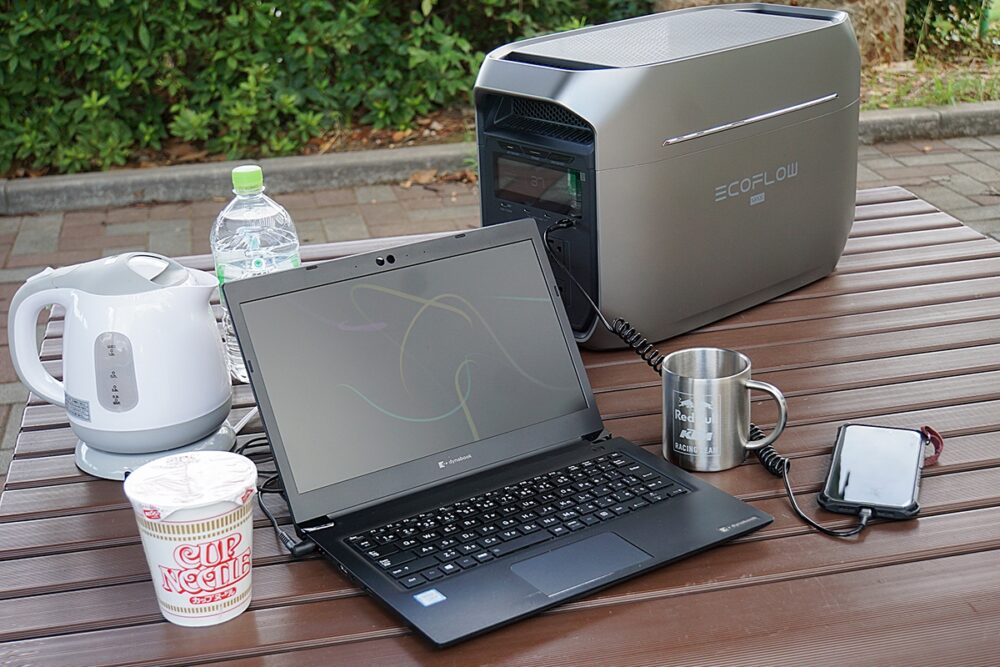これだけノートパソコンの近くに置いても問題なし。さまざまな機器に同時に給電することができるので、スマートフォンの充電やお湯を沸かしてコーヒーやカップラーメンを作ることもできる。たまにアウトドアで仕事をするのも気分転換になって良い。