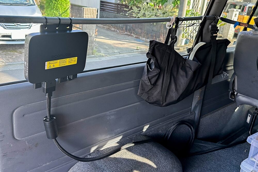 薄型の800wオルタネーターチャージャー本体を壁面に取り付ける。今回はテスト運用なのでサイドバーに吊るしてみた。配線はかなり長いので装着場所の自由度が高く、ほとんどの車種で問題なく取り付けられるはずだ。