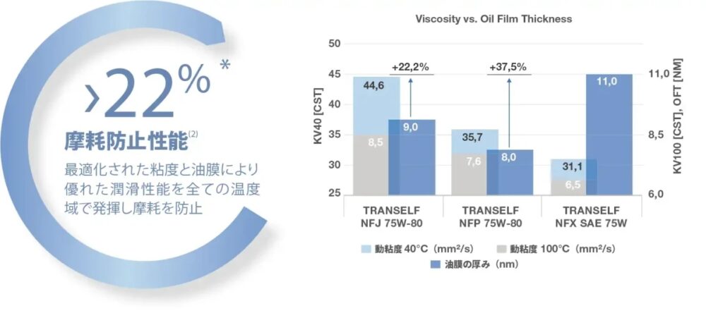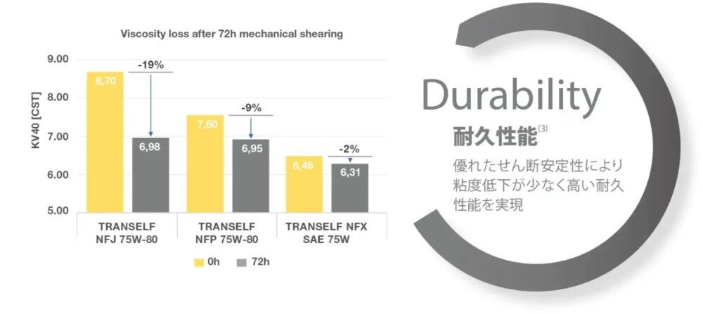 たとえば、「TRANSELF SYN FE 75W-90」は、スポーツモデルから、トレーラー牽引車両など、高負荷のかかる場面で優れた耐久性と潤滑性能を発揮するギヤオイルであり、高温下でも油膜保持性に優れ、長距離走行やサーキットユースにも対応可能。