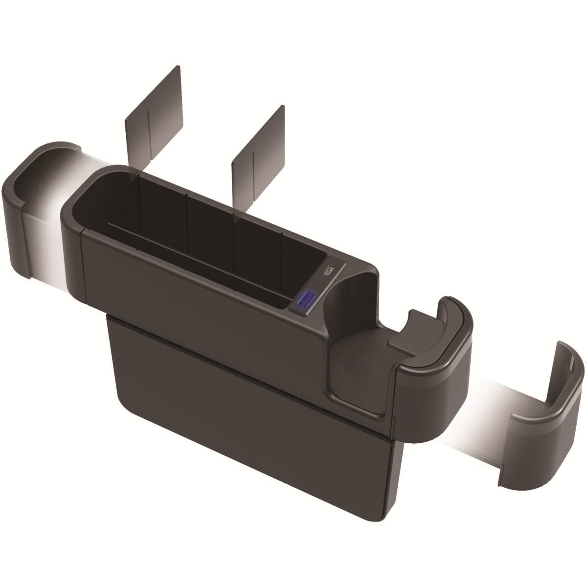 天面トレイはスライド式で、アームレスト装備車でも邪魔になりにくい設計。さらに、ケーブルを通しやすい穴とケーブルホルダー、レジ袋を掛けられるユーティリティーフックまで備えているので、収納だけでなく実用性の幅も広い。取付けはシートの間にアンカーパーツを差し込むだけで、位置調整も簡単。オープンプライスながら、日常使いのストレスを減らす機能が詰まったアイテムといえる。