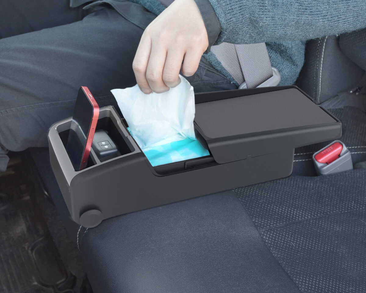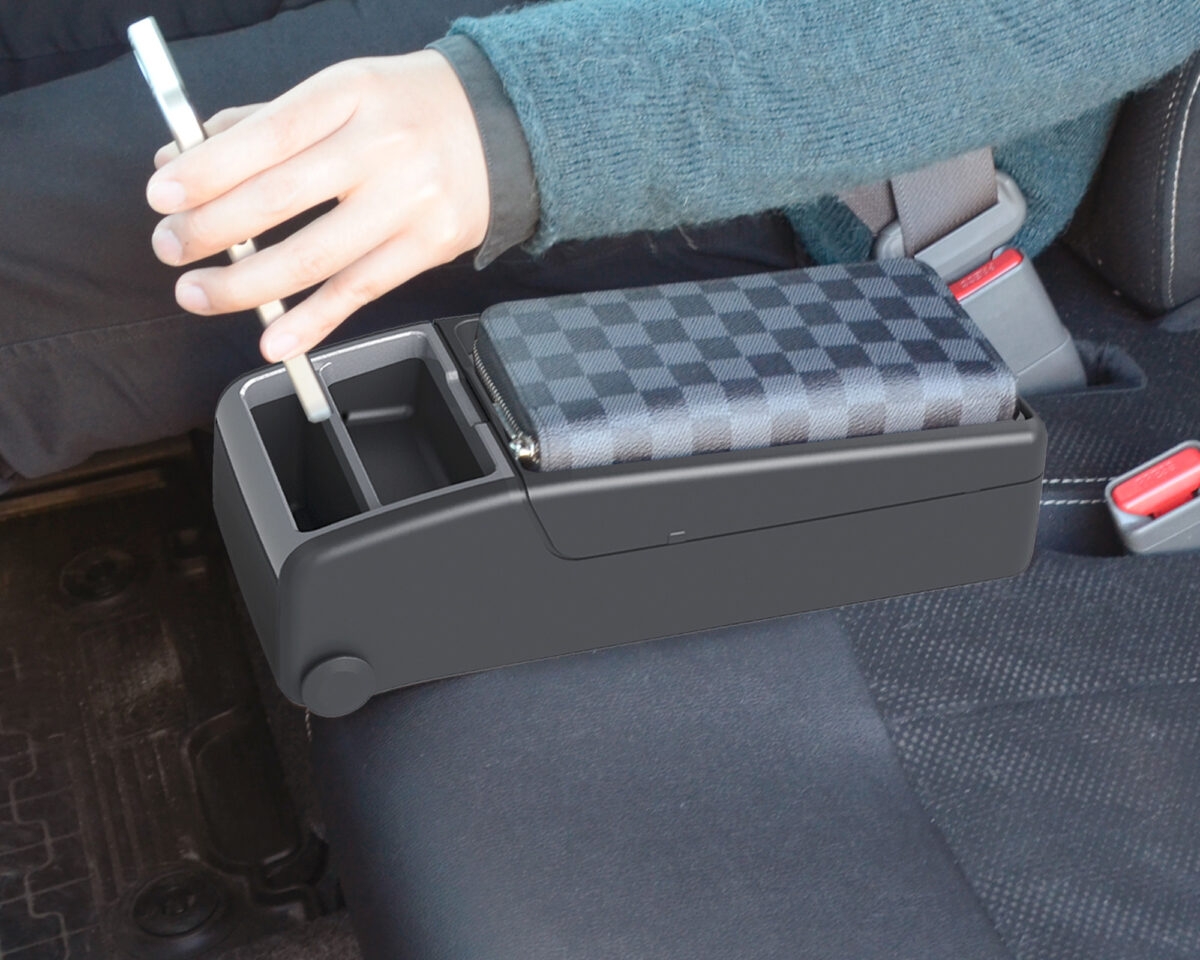 後席まわりの収納不足を解消したいなら、星光産業の「コンソールトレイ EE-38」が便利だ。軽自動車や普通車の後席ベンチシート向けに設計されたコンパクトなコンソールトレイで、ソフトパックティッシュや長財布が収まりやすく、深さの異なる2つのポケットでスマホやキー、コイン、チケット類などを整理しやすい。細かなモノが散らかりがちな車内を、すっきり見せやすい構成である。