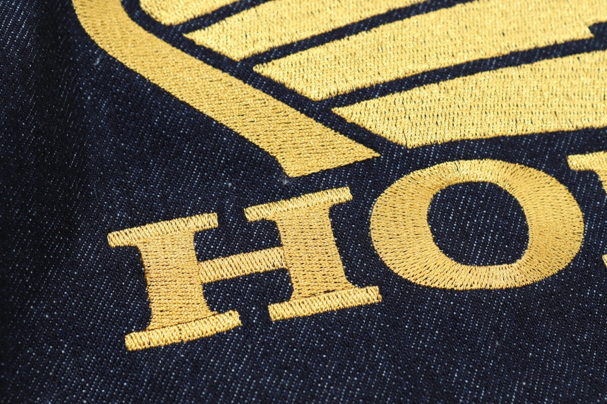デニム生地を使用するMA-1というだけでもこれまでにない斬新さが特徴ですが、今回はホンダコラボモデルということで背中には大きなウイングマークを精緻な刺繍で再現。その針使いはホンダマニアも納得のクオリティです。デニム生地に映えるゴールドの糸の刺繍はゴージャスな印象。また各部の縫製はジーンズと同じ金茶の糸を使用しています。
