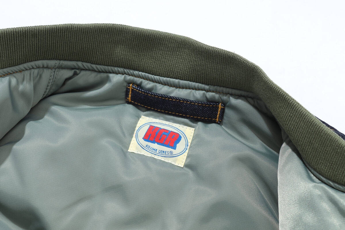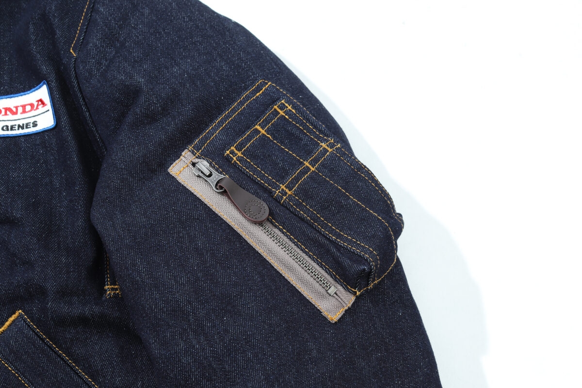 MA-1はその軽さとシンプルなスタイル、そして冬の街着としてもちょうどいい防寒性からストリートアパレルとしても広く浸透しました。今回児島ジーンズがKGRブランドからリリースするホンダとのコラボジャケットは、そのMA-1をオマージュしたもの。ボディは貴重なオリジナルのMA-1を丹念に解析して、そのシルエットやディテールを再現していますが、最大の特徴は表地にデニムを使用して、そこにホンダのウイングマークをあしらっていることでしょう!