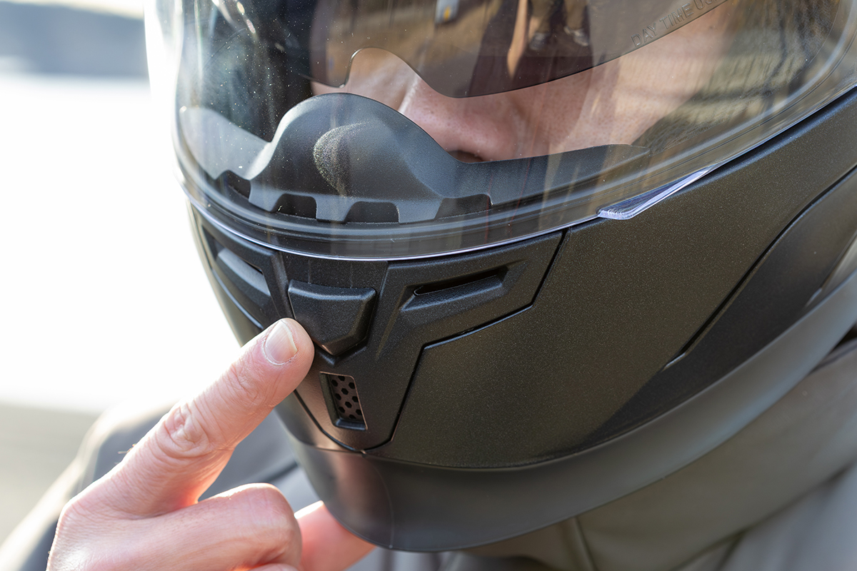 口元と前頭部に開閉できる走行風の導入口、後部上に排出口を備えており、フレッシュな走行風をヘルメット内に通すことで蒸れを抑制。シールドの曇りを緩和できる。グローブをした手でも操作しやすい。