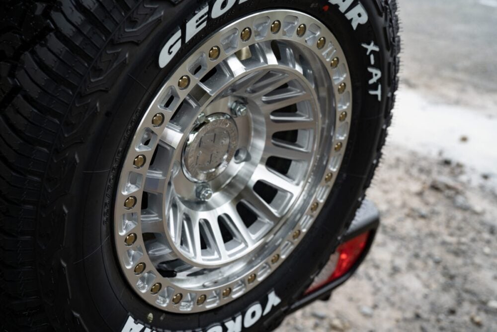 外周部に備えたビードロック風リムにも注目したい。リムとは色味の違う別体式のステンレス製ボルトを採用。耐食性を高めるため一度ポリッシュして、その後に艶消しスモーククリアをかけることで、リアルなムードを醸し出している。さらにリムフランジを貫通しているのも見所。立体感のある形状は、アメリカの競技用ホイールが採用するもので、ドロや砂を逃してパフォーマンスを維持し、汚れにくくする効果が得られるというものだ。
