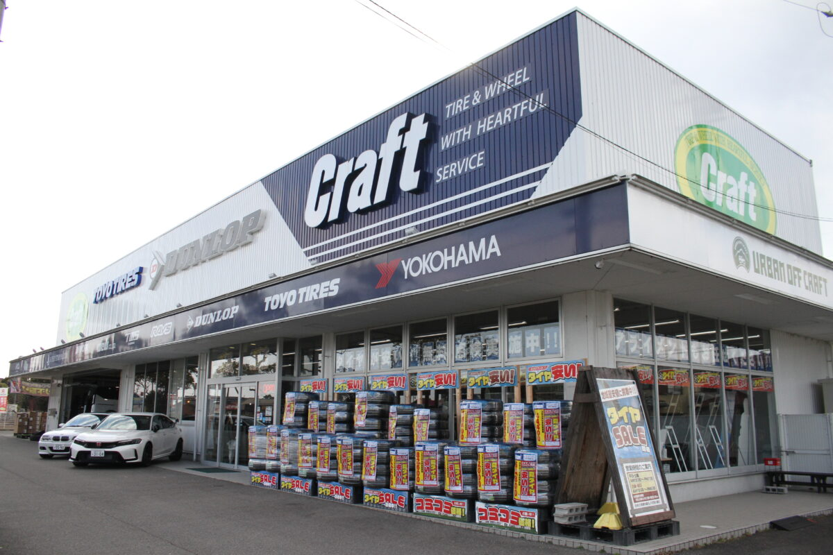 クラフトは、乗用車用タイヤとアルミホイールを中心に自動車用品・部品の販売サービスを行う「タイヤ&ホイールの専門店」。1972年創業で、店舗では3Dアライメントなどのピットサービスに対応し、PIT予約も用意。買取・下取にも対応し、URBAN OFF CRAFT併設店など、ドレスアップから四駆カスタムまで相談しやすい体制が特徴だ。