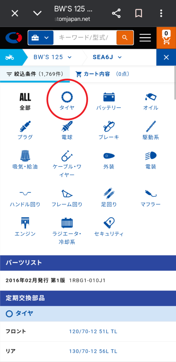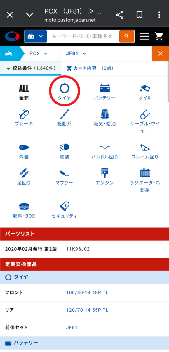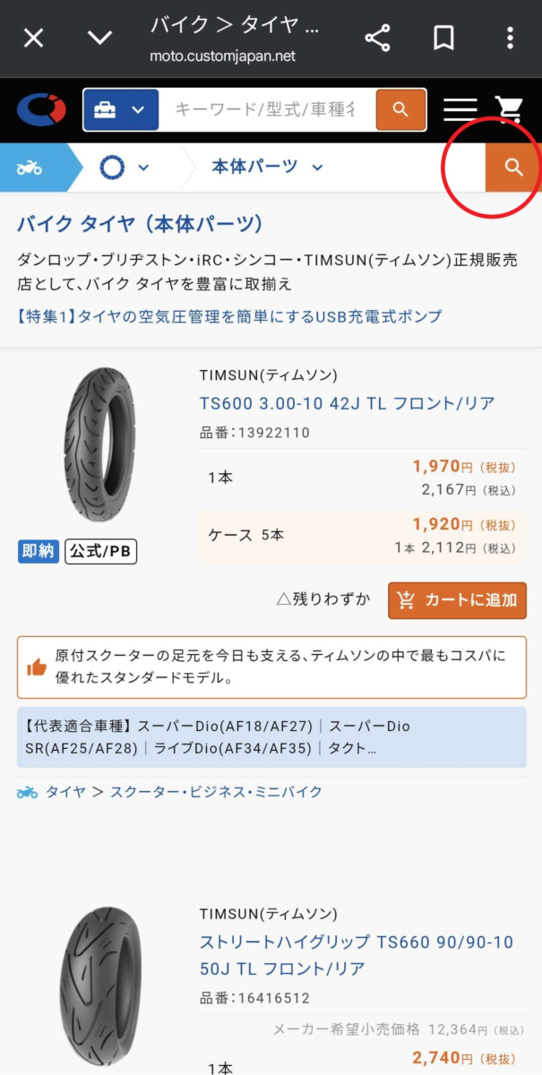 ②バイク用タイヤがすべて表示されるので、赤丸の🔍をクリックして絞り込む。