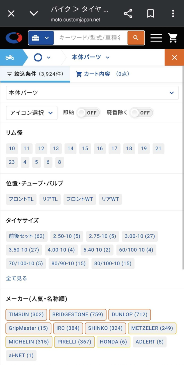 ③リム径(17インチ、18インチなど)、チューブ・バルブ、タイヤサイズ、メーカーなど、自分の条件に合ったアイコンを選択。各項目のアイコンは複数選択も可能。