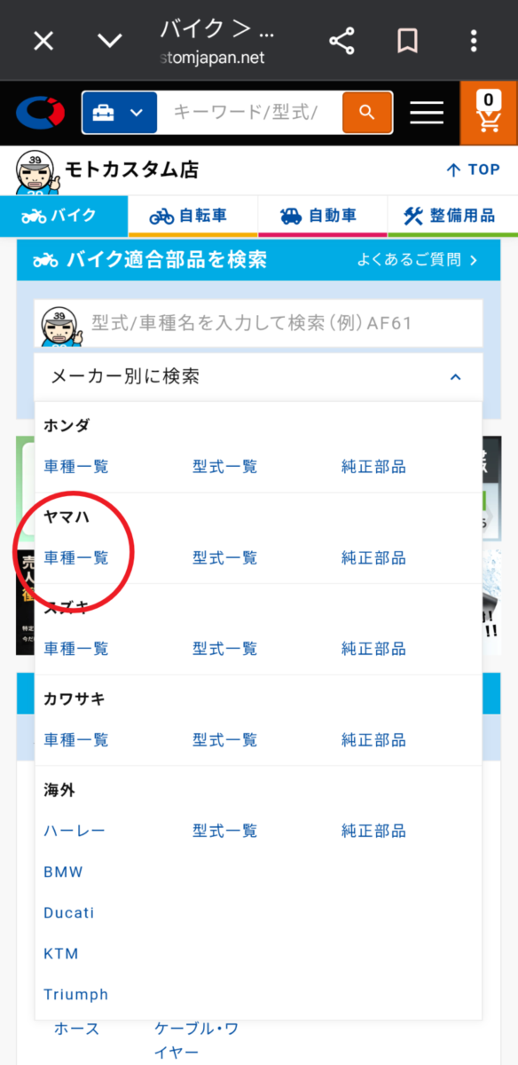 ①「バイク適合部品を検索」からわかる範囲での条件をタップ。ここでは車種一覧を選択。